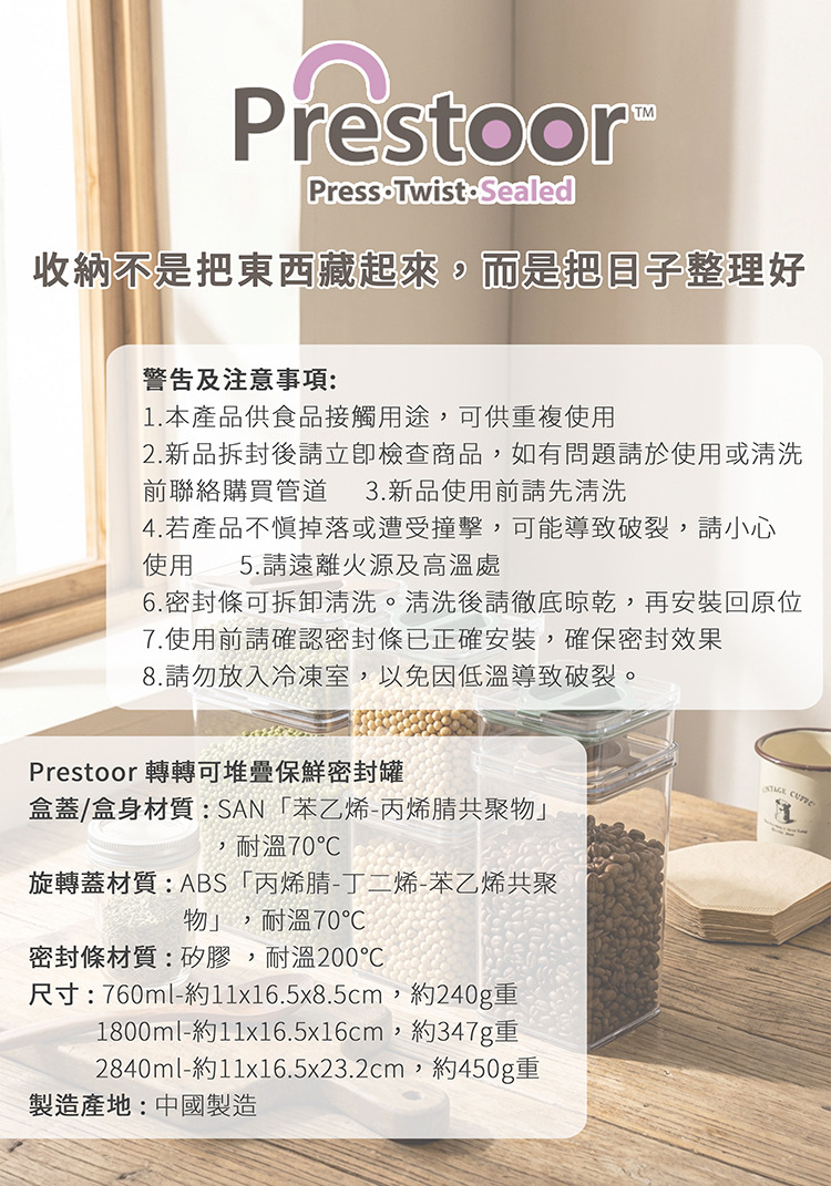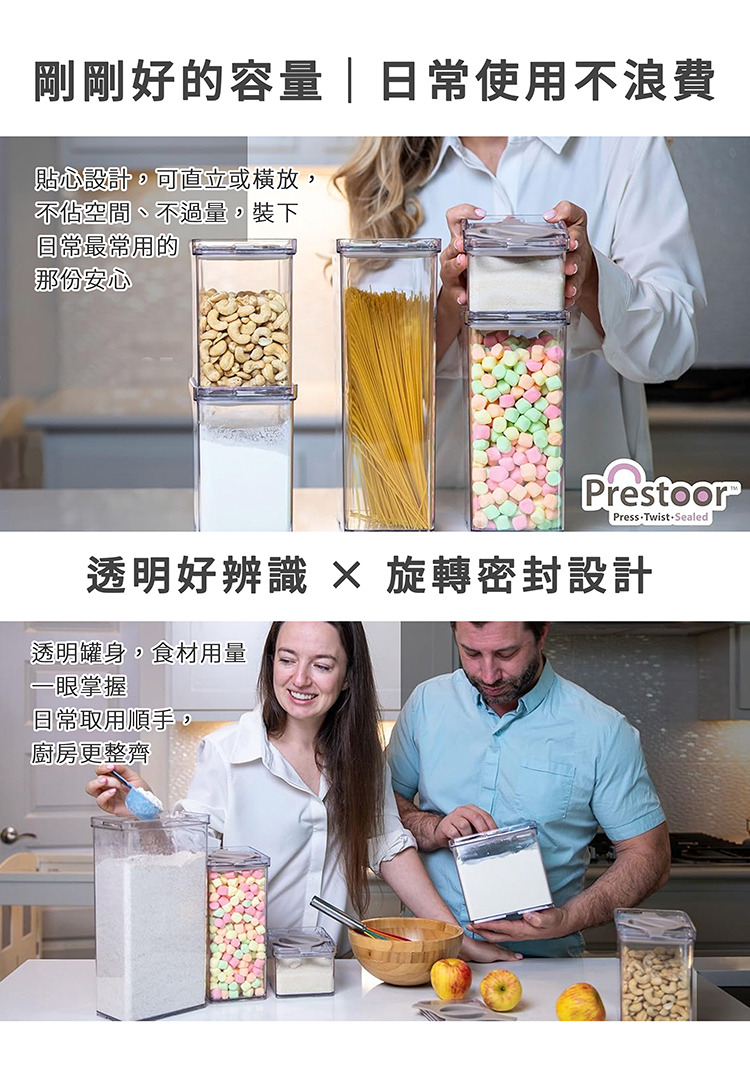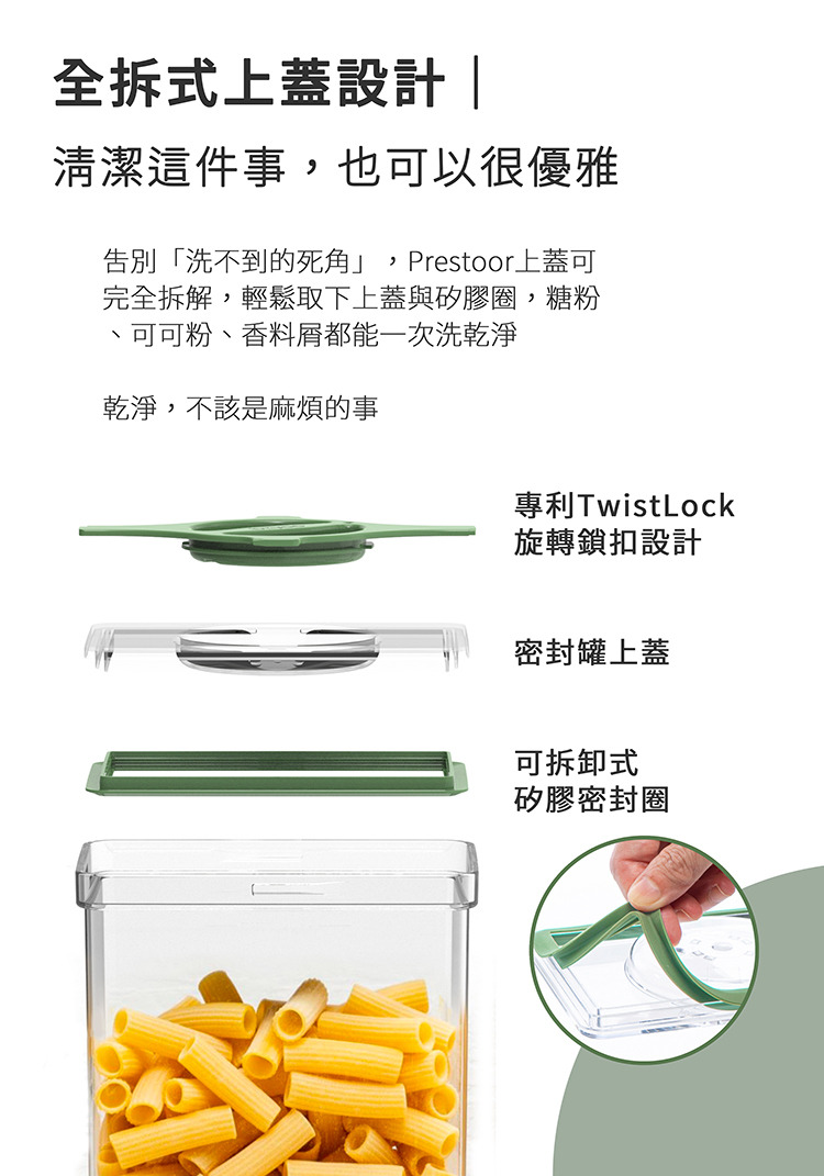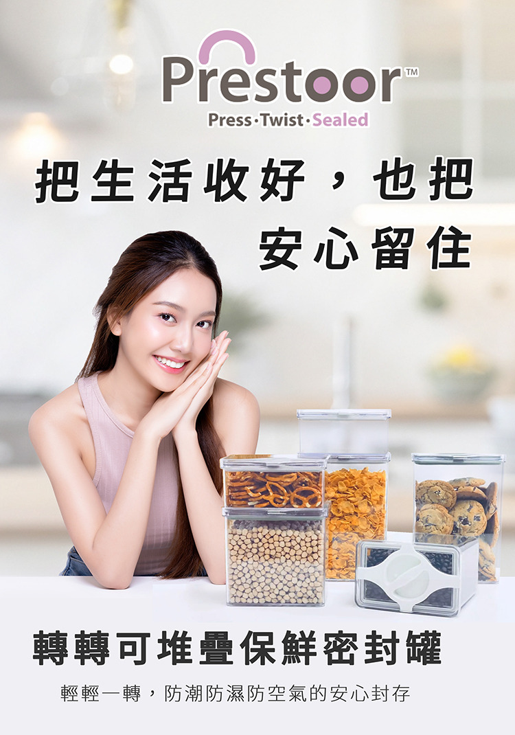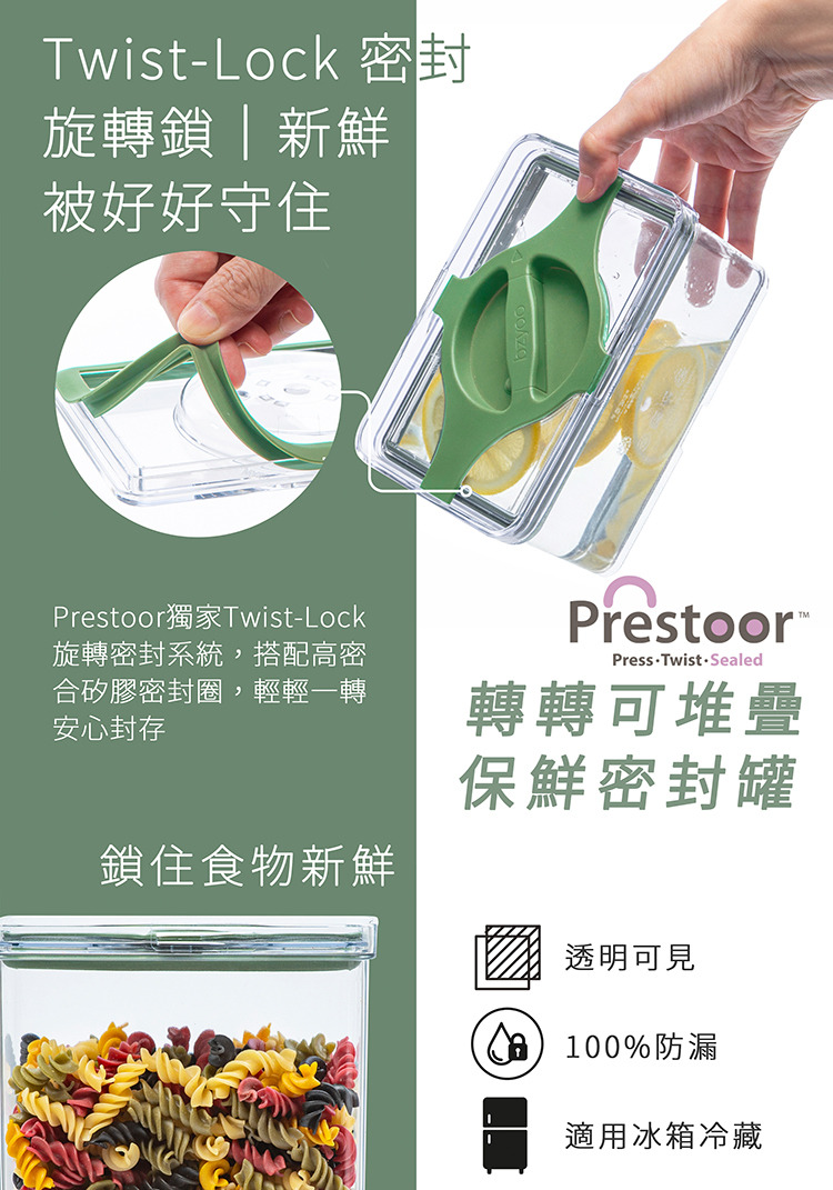 Prestoor獨家Twist-Lock旋轉密封系統,搭配高密合矽膠密封圈,輕輕一轉安心封存