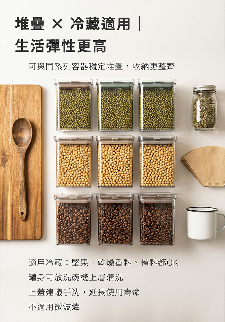 bzyoo Presto+ 轉轉可堆疊保鮮密封罐 。搭載獨家 Presto 旋轉密封蓋,只需單手輕轉即可達成優異的氣密效果,有效延長食材保鮮期。瓶身採用高品質、不含雙酚 A (BPA Free) 的安全材質,耐衝擊且不殘留異味。特殊的 可堆疊凹槽設計,能極大化節省櫥櫃空間。極簡的雲霧白配色,完美融入現代北歐風或日系廚房裝潢,是收納咖啡豆、乾貨或零食的理想選擇。