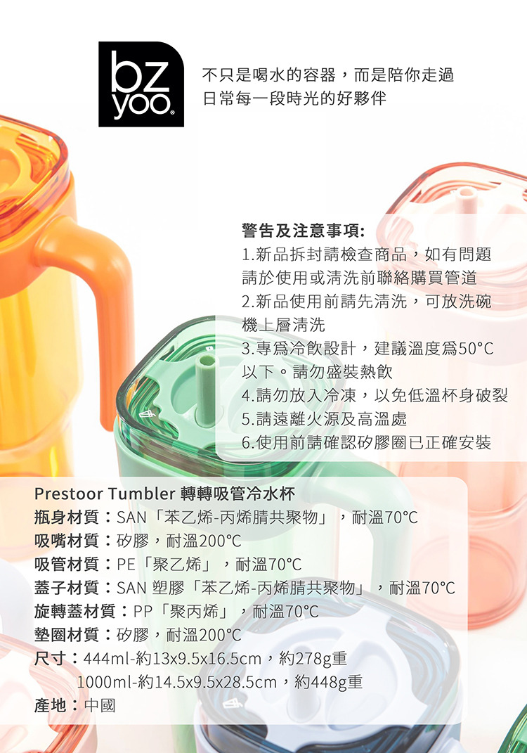 3 . 本商品專為盛裝冷飲設計,建議飲用溫度為 50°C 以下。請勿盛裝熱飲,以避免使用吸管時造成燙傷風險。