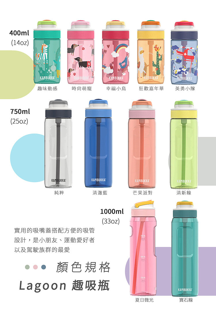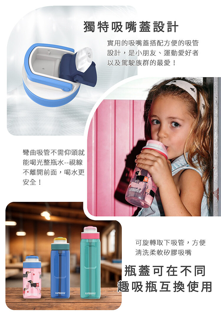 一體式吸管設計,在暢飲同時,可以吸到完全乾淨,獨特吸嘴蓋設計,瓶蓋可在不同趣吸瓶互換使用。