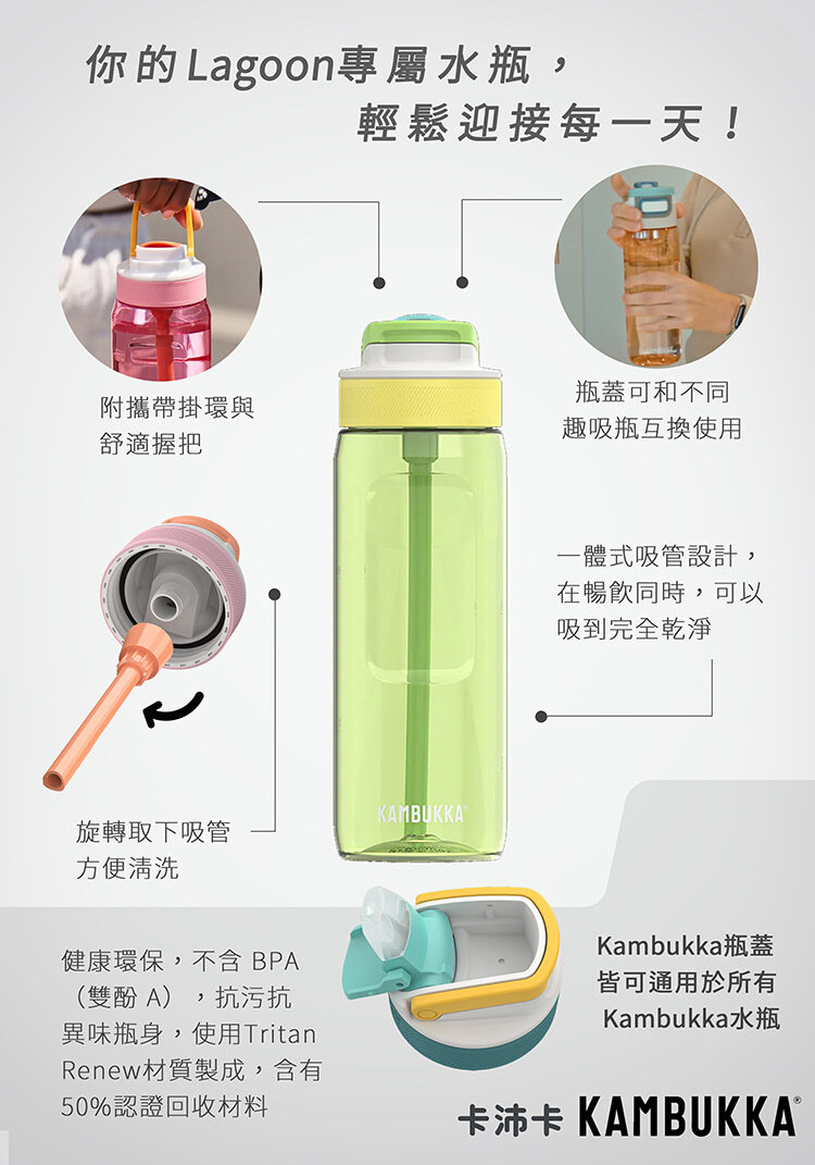 全新升級防漏水瓶,附攜帶掛環與舒適握把,單手即可飲用 ,健康環保,不含 BPA(雙酚 A),抗污抗異味瓶身,使用Tritan Renew材質製成,含有50%認證回收材料。