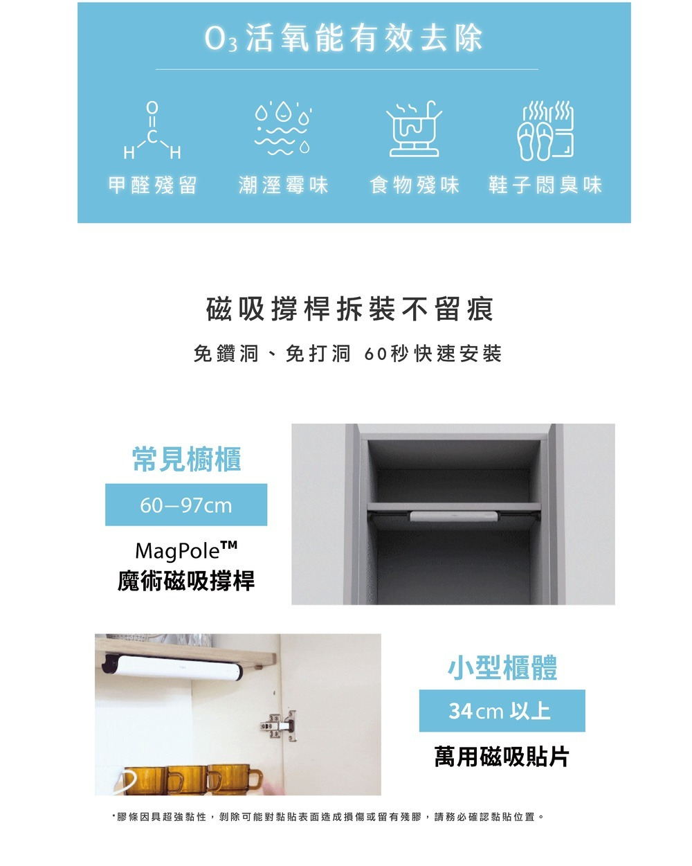 ● 免打洞、免鑽牆:無痕磁吸撐桿,隨處安裝