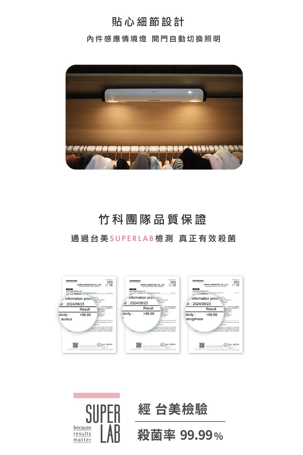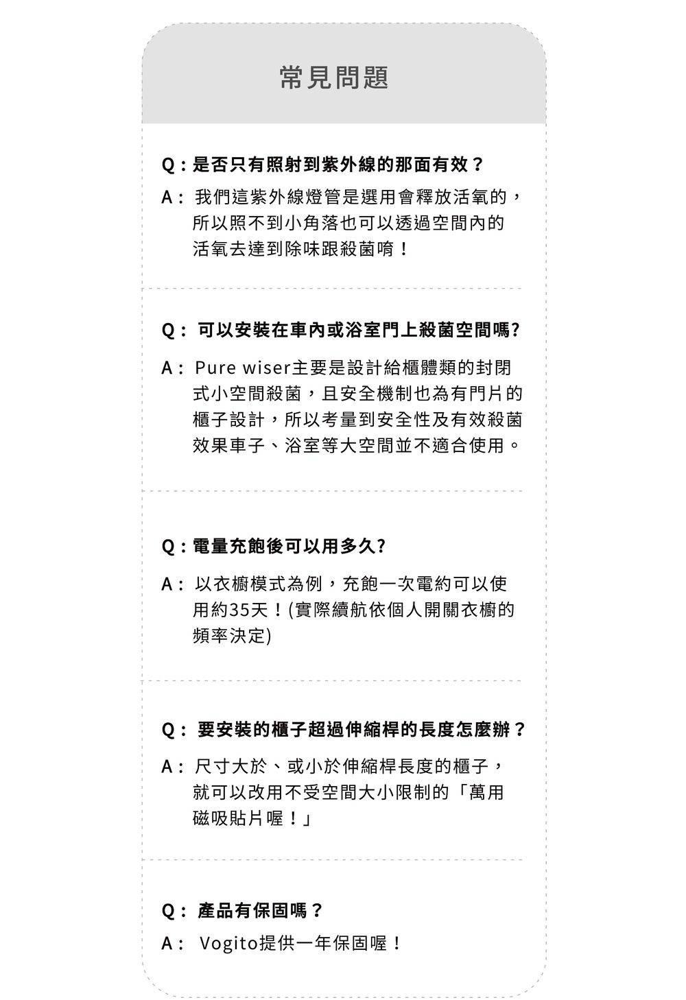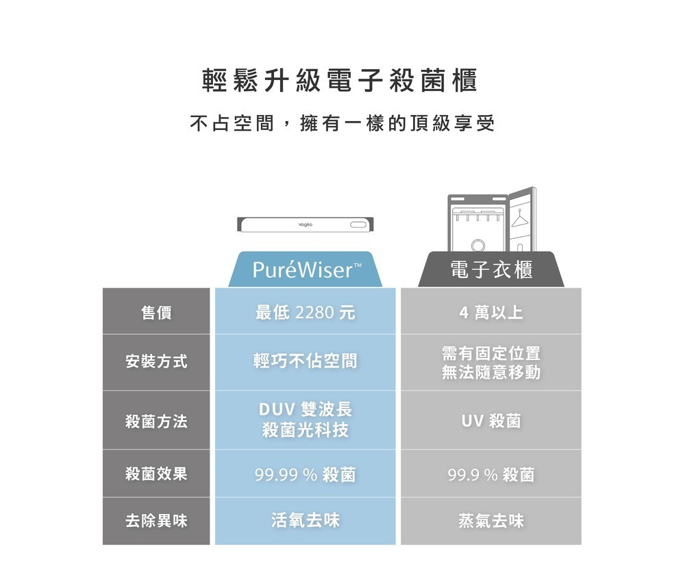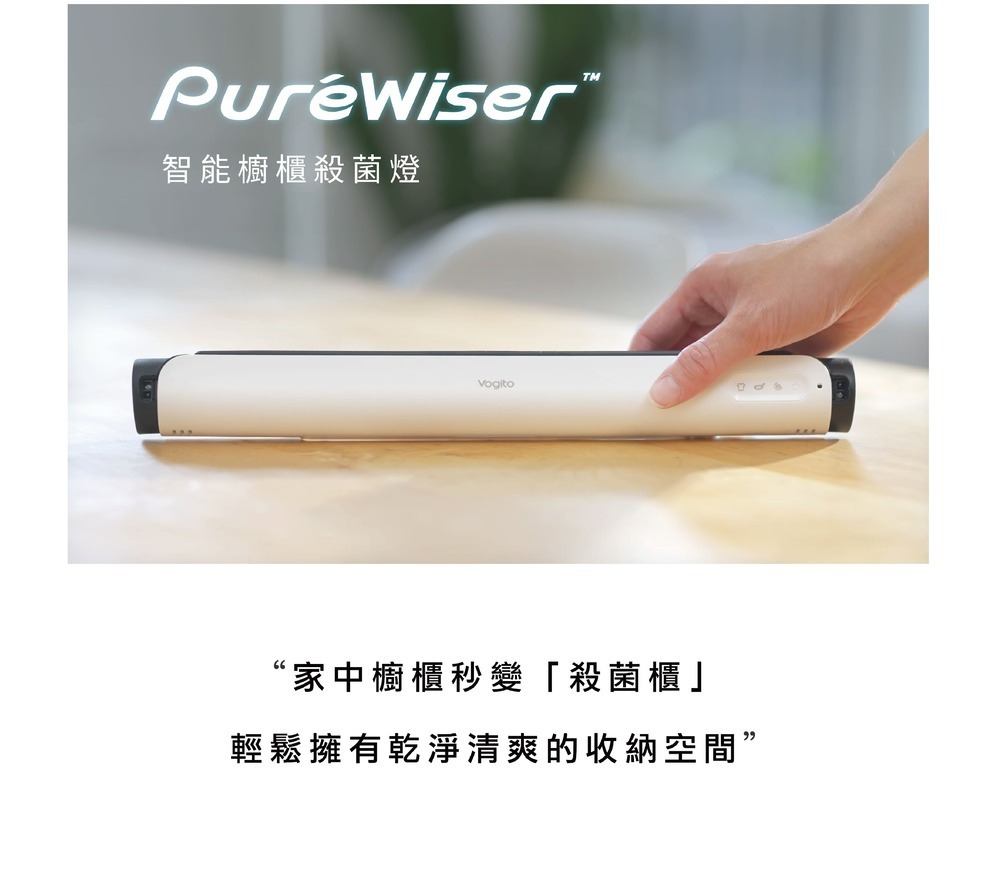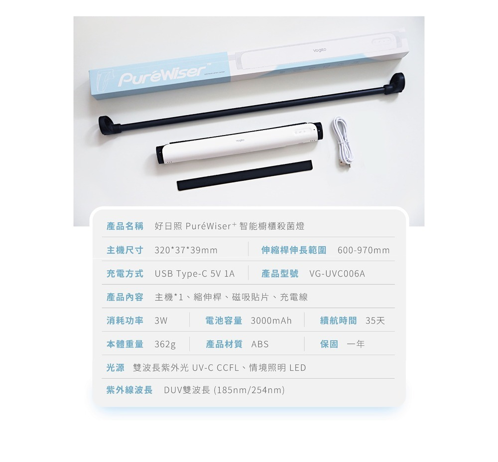 內容物 : PuréWiser⁺™智能櫥櫃殺菌燈(一入)、Type-C充電線(一條)、魔術撐桿(一入)、磁吸貼片(一入)